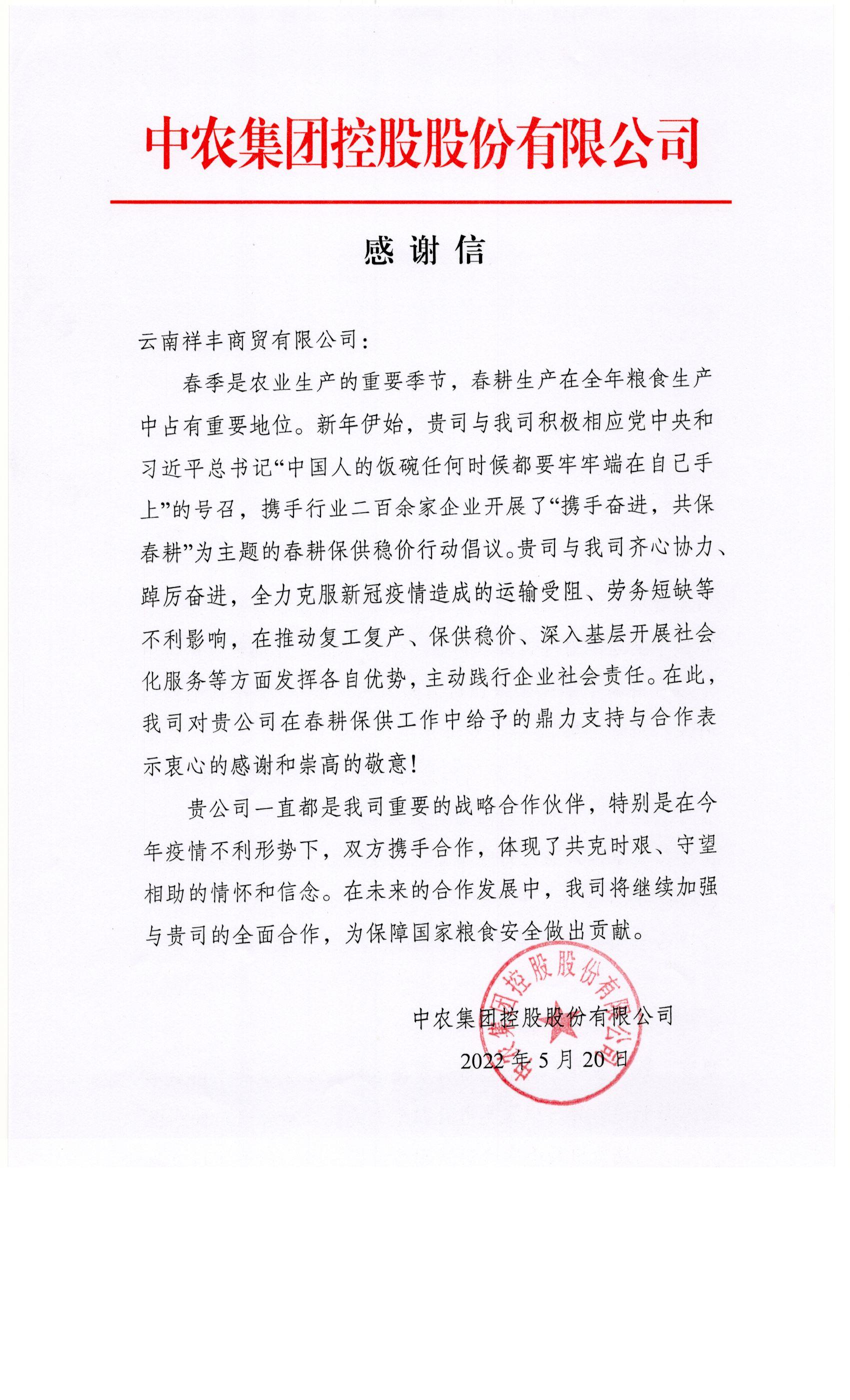 2022年5月20日,云南祥豐商貿(mào)有限公司收到中農(nóng)集團(tuán)控股股份有限公司的感謝信,主要對(duì)云南祥豐商貿(mào)有限公司在春耕保供工作中給予的鼎力支持與合作表示感謝。